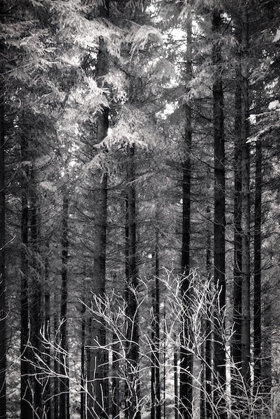Tension de lumière entre le haut et le bas de l’image en même temps qu’une opposition de graphismes. Entre les deux, j’aime beaucoup la douceur des textures grises dans les pins.