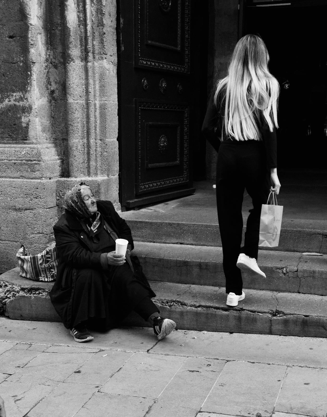 Tout étant dans le jeu des pieds et dans le dialogue entre le sac et le gobelet, je me demande si je n’aurais pas cadré horizontalement sur cette partie de la photo.